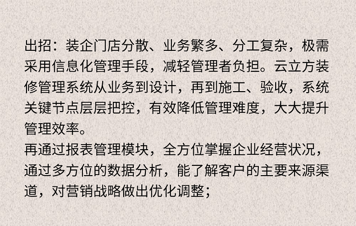 与此同时,有位科技老兵立身行业数年,堪称心得五车、经验八斗,深得上万装企信赖与认可。问其姓甚名谁?——云立方装修管理系统。