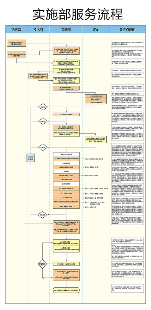 问题收集与反馈流程图、定制开发流程图、实施部服务流程图,经过多次打磨后,使各部门的工作和沟通,更加流程化、标准化。