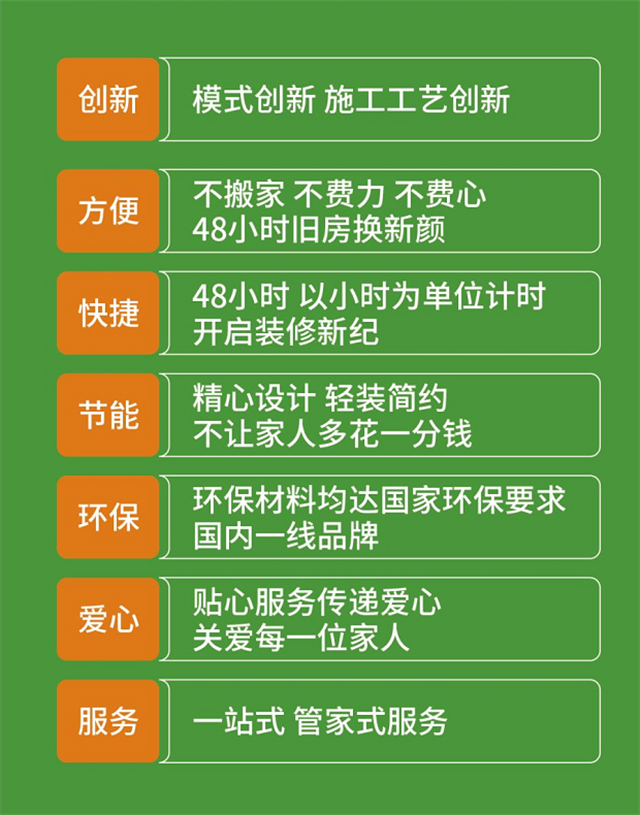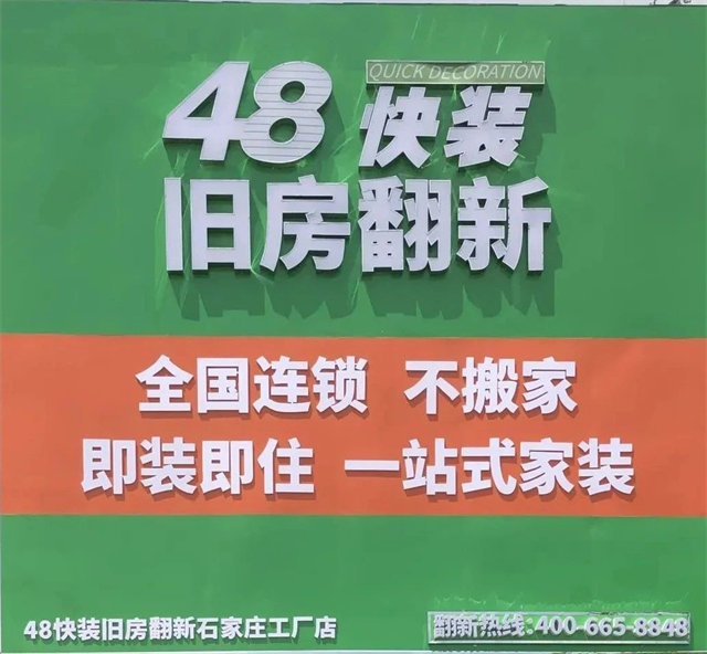 48快装选择旧房翻新这块市场,提供有温度的服务,承诺套餐内容保证48小时完工,质量不合格立即重装,预算=决算,中途绝不加价,绝不多收客户一分钱。