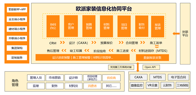 用一套系统,全面打通客户管理、设计方案、工程管理、供应链采购、财务管理等装修全链路数据流,打破信息孤岛、让装修过程多环节透明化和标准化,用数字化的标准管理实现成本管控,提效增益!携手推动整装大家居落地装企ERP!