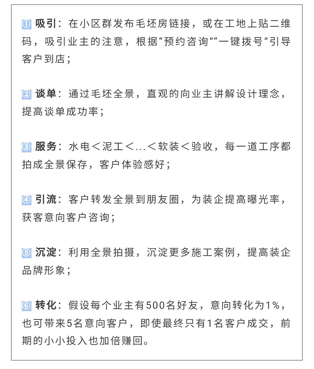 除了通过线下展厅的实地观看,也可以通过720°全景的线上模式,来完全还原展厅真实场景,感受“看到即走到”的便利,还可以在所有社交平台,如微信等一键分享,一键传播。