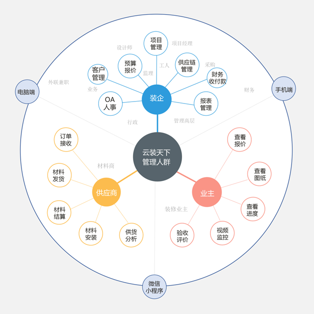 而云装天下管理系统,已经覆盖到装饰企业的所有业务流程,赋能装企简化装修流程、缩短产业链条、降低运营成本、提升整个装修效率及品质。