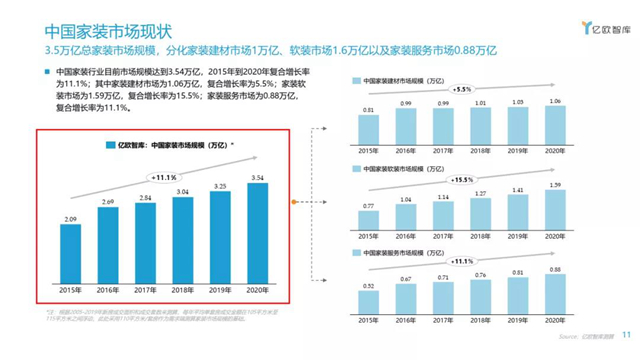 3.5万亿总家装市场规模分化家装建材、软装市场及家装服务。家装服务市场增速明显加快。