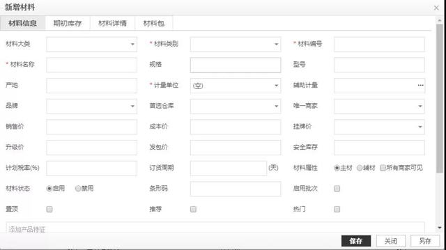 装企在系统里的“材料宝典”录入标准模式,包括材料大类、材料类别、材料编号、材料名称等,材料员发起申购单时,可以直接选择所需的材料,按需下定。如果遇到特别的材料,系统也支持自定义。