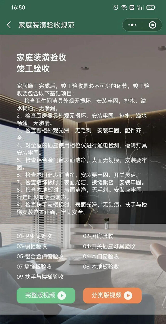 微信小程序搜索:家装验收报告,就可以看到水电验收、泥木验收、涂装验收、竣工验收四大流程的视频验收标准。