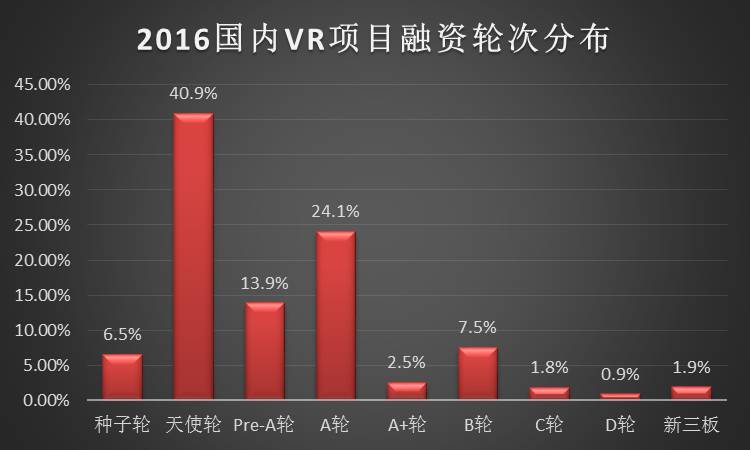 对于创业者来说,VR早已成为大部分人心中的风口。近几年VR行业的创业者倍增。其中跑的比较快的团队和公司,已经开始进入B轮以后,而大部分公司主要集中在A轮以前,其中比例最大的是获得天使轮融资的团队或公司,占比达到40.9%。不难发现,国内的VR企业们尚处在初级阶段,但由于VR本身的市场潜力很受资本看中,所以一直发展较快,预计今年过后,大部分的VR企业将进入B轮。