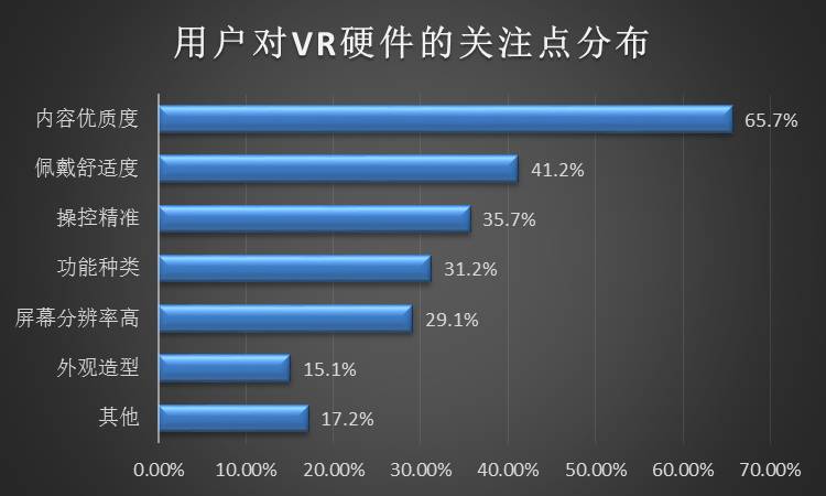 用户对于VR设备的关注度与日俱增。在VR硬件设备的关注点分布图中我们可以发现,用户最关心的还是内容。几乎绝大多数的用户都对VR内容的多样性、优质程度抱有较大关注。和一般的视频内容不同,由于VR内容的制作要求比较高的技术和成本,所以国内的VR内容并不是十分成熟,当前已经有越来越多的创业团队倾注在此,相信优质的爆款内容出现后,将会大大提升用户对于虚拟现实的认知。
