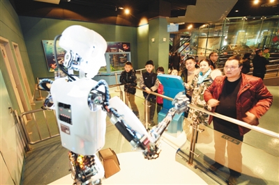 一月三十一日,宁夏科技馆推出“闻鸡起舞闹新春”春节科普活动。“年俗科普”“人工智能”等多项主题展览吸引市民前来参观。图为观众在观看机器人表演。