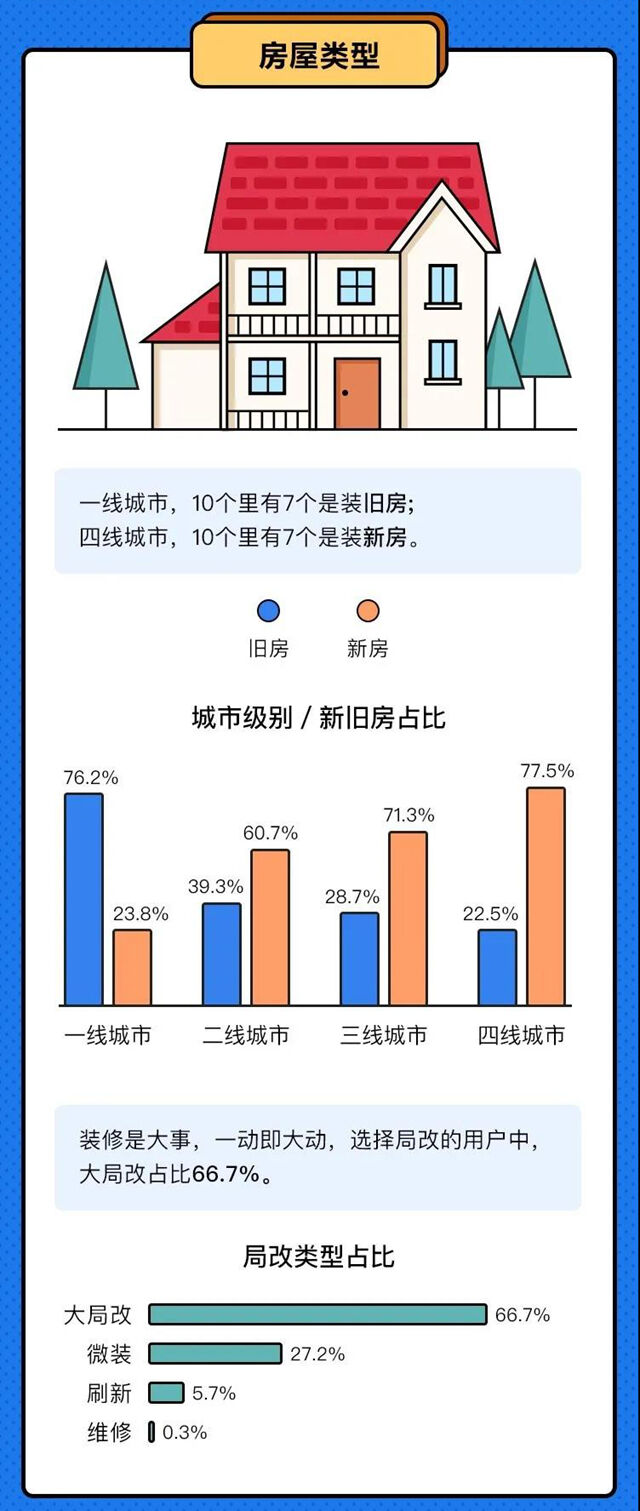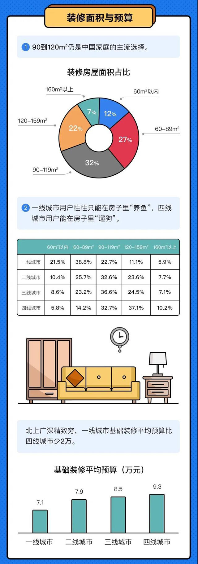报告显示,北上广深等一线城市在基础装修上,业主的平均预算只有7.1万元,二线城市接近于7.9万元,三四线城市会更高,分别为8.5万元和9.3万元。