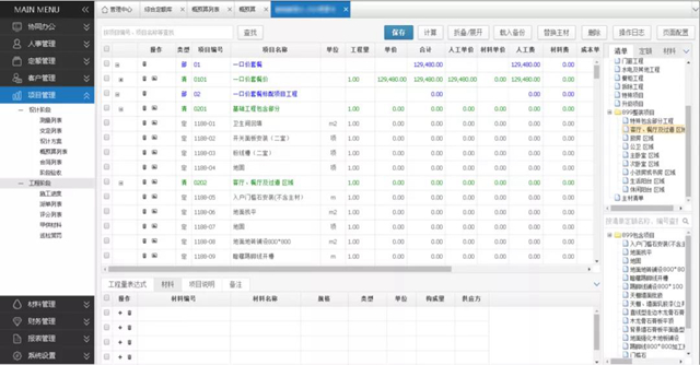 系统支持各种报价模式,并且可以在各种报价模式中自由切换,适应装企的各种个性化报价需要,最大程度满足客户需求;系统可快速生成和打印报价书,可自定义主材估算,可打印封面、主材估算、编制说明、附件、通用材料、测量标准等等;业主可随同设计师到材料展厅查看样品,并现场扫码确认所需材料,系统将自动生成预算报价;后端采购人员通过预算报表,一键下单进行采购,并线上对接建材供应商端口。